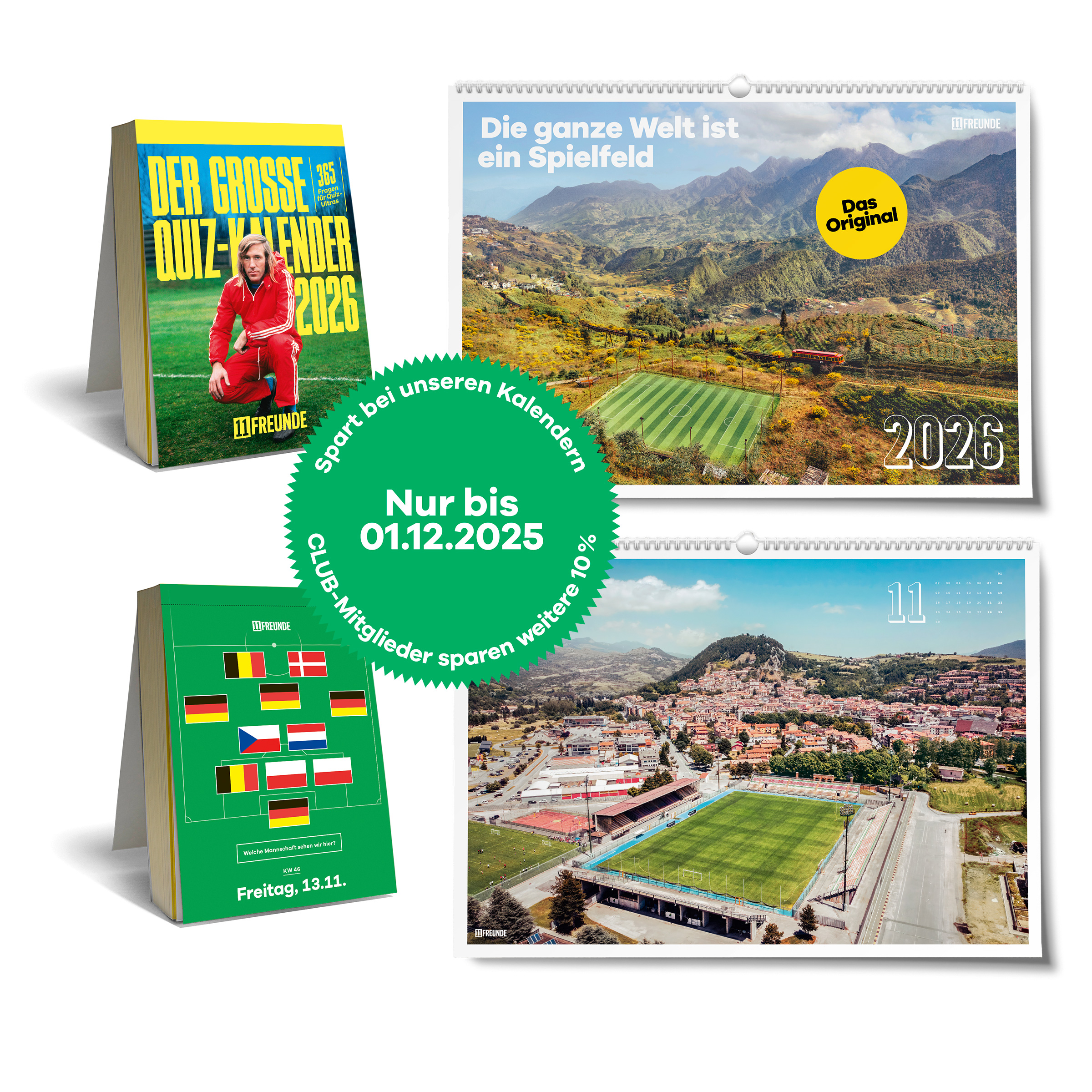 Eilmeldung! Bis zum 02.12.2024 gibt's sensationelle Preisnachlässe auf unseren XL-Wandkalender "Die ganze Welt ist ein Spielfeld 2025" und auf den Tagesabreißkalender "Der große 11FREUNDE Quizkalender 2025".